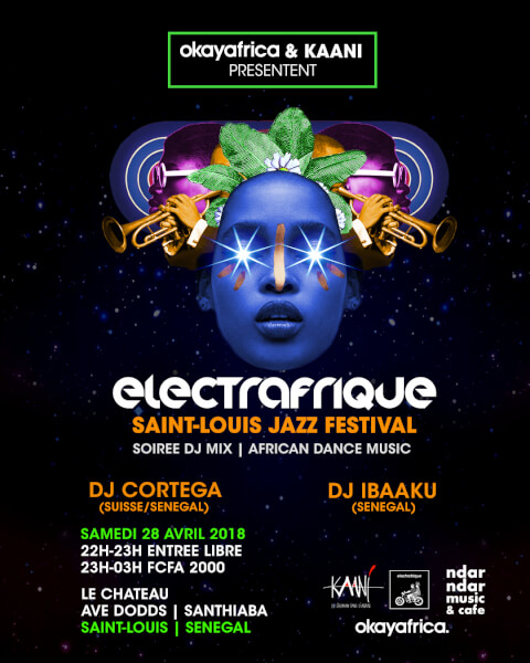 #SaintLouis !! 🔥🔥 ::: Nous avons l'énorme plaisir d'annoncer notre première soirée ElectrAfrique à Saint-Louis le 28 Avril prochain, en marge du légendaire Festival Jazz De Saint Louis !! :: Ibaaku & DJ Cortega seront aux commandes et la famille OkayAfrica KAANI & Ndar Ndar music & café à la production ! 🎵✨🎷✨🌶✨🌴 Ibaaku grande figure de la scène underground sénégalaise, qui mixe des sons "afrofuturistes" où se retrouvent rythmes traditionnels, simples, hip-hop, jazz, reggae & voix. Découvrez cet artiste atypique qui va mettre le feu au Dancefloor !🌴👑💥 DJ Cortega panafricain initiateur des soirées ElectrAfrique, il maîtrise l'Afrohouse & enflamme le Dancefloor dakarois depuis une année et demi ! Click to bounce: 💥👑🌴 www.soundcloud.com/cortega Lieux : Le Château, Avenue Dodds | Santhiaba, SAINT-LOUIS Samedi 28 Avril 2018. 22H - 23H | Entrée libre 23H - 03H | Entrée 2000 FCFA. Design by the fam @kernubia